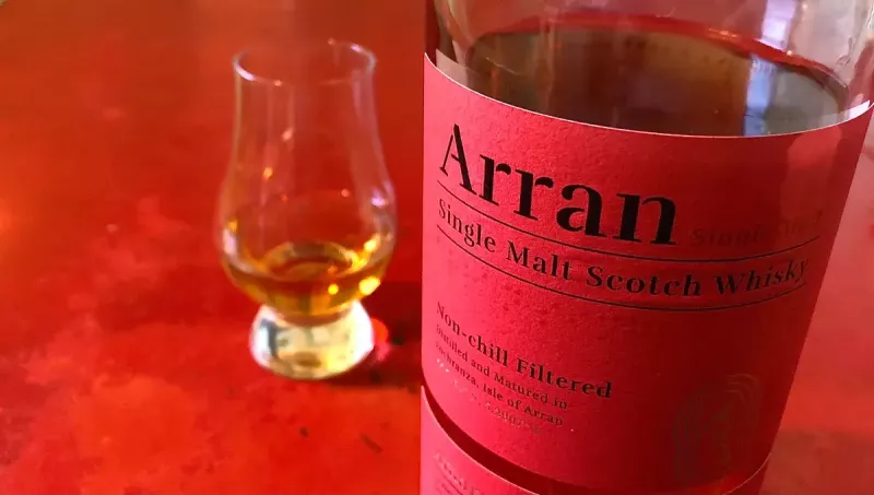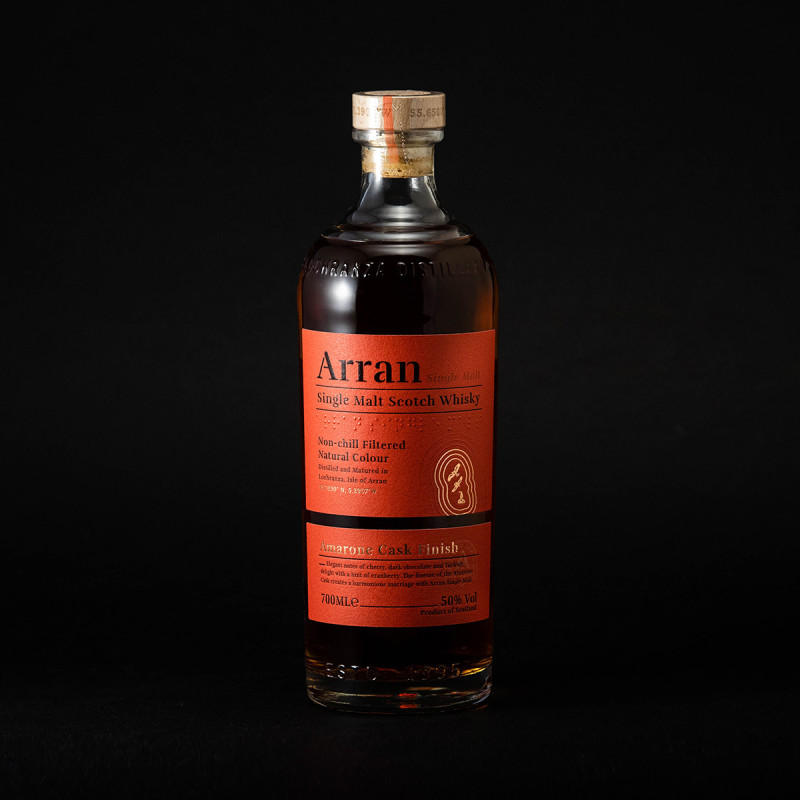 Táto výnimočná whisky Arran Amarone Cask Finish pochádza z destilérie Arran na škótskom ostrove Isle of Arran, ktorá pôsobí od roku 1995. Whisky najprv dozrieva v tradičných ex-bourbon sudoch približne 7 – 8 rokov a následne prebieha finálne zrenie v sudoch po Amarone, víne z regiónu Veneto v Taliansku. Toto spojenie dodáva nápoju intenzívnu červenú farbu a výrazný ovocný charakter.