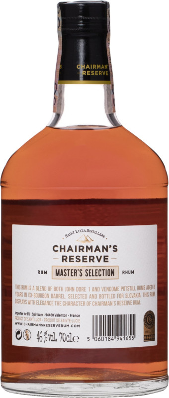 Rum Chairman's Reserve Master's Selection for Svet nápojov pochádza z karibského ostrova Sv. Lucia a ukrýva blend dvoch skvelých melasových rumov John Dore 1 a Vendome 2012. Rumy boli destilované metódami Double Retort a Pot Still. K výbornej chuti prispieva aj 8 rokov zrenia v dubových ex-bourbon sudoch. Výsledok vyniká vysokým obsahom esterov, ktoré sú zodpovedné za výrazný a bohatý chuťový profil odrážajúci elegantný charakter rumov Chairman's Reserve.