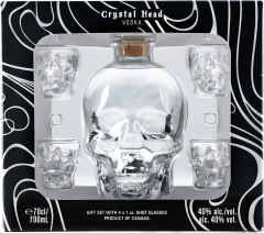 Set obsahuje vodku Crystal Head 0,7 l a štyri poháre v darčekovom kartóne.