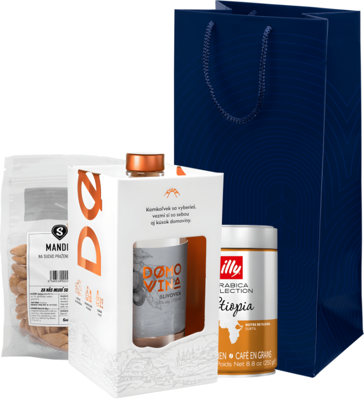 Darčekový set Domovina Slivovica (set 1 x 0.7 l) - elegantný darčekový set, ktorý spája tradíciu a kvalitu. Nájdete v ňom slovenskú Domovina Slivovicu v darčekovej krabičke, výberovú talianskú kávu Illy Etiopia 250 g, chrumkavé pražené solené mandle od Svět Plodů (200 g) a elegantnú darčekovú tašku. Ideálny darček pre každého, kto ocení poctivé chute a štýlové balenie.
