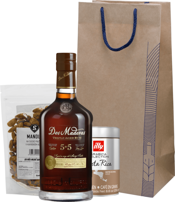 Darčekový set Dos Maderas PX 5+5 (set 1 x 0.7 l) - tento exkluzívny set obsahuje ikonický Dos Maderas 5+5, výberovú talianskú kávu Illy Costa Rica 250 g, chrumkavé mandle Svět plodů v karibskom korení a elegantnú darčekovú tašku. Perfektný darček pre gurmánov a milovníkov prémiových chutí.