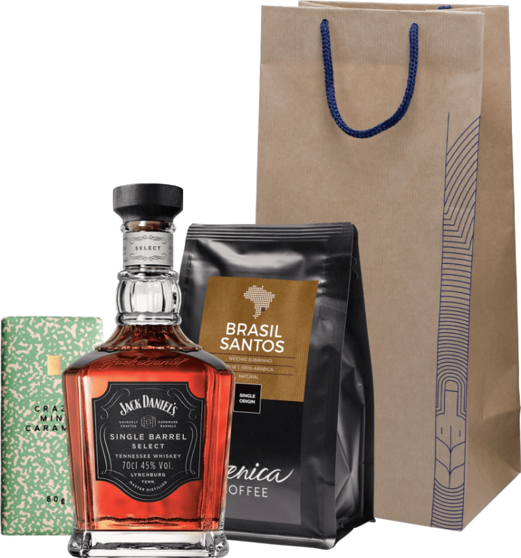 Darčekový set Jack Daniel's Single Barrel (set 1 x 0,7 l) - tento elegantný set obsahuje prémiovú whisky Jack Daniel’s Single Barrel, slovenskú kávu Ebenica Brasil Santos 220 g, slovenskú čokoládovú špecialitu Lyra Crazy Coffee a štýlovú darčekovú tašku. Spojenie americkej whisky, aromatickej kávy a prémiovej čokolády je ideálnym darčekom na každú príležitosť.