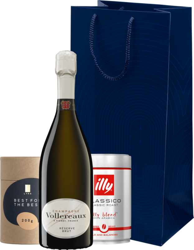 Darčekový set Vollereaux (set 1 x 0.75 l) - exkluzívny set spája šampanské Vollereaux Réserve Brut, lahodnú kávu Illy Classico 250 g a prémiovú čokoládu Lyra Best for the Best. Ideálna voľba na oslavy, jubileá či ako luxusný darček pre gurmánov.