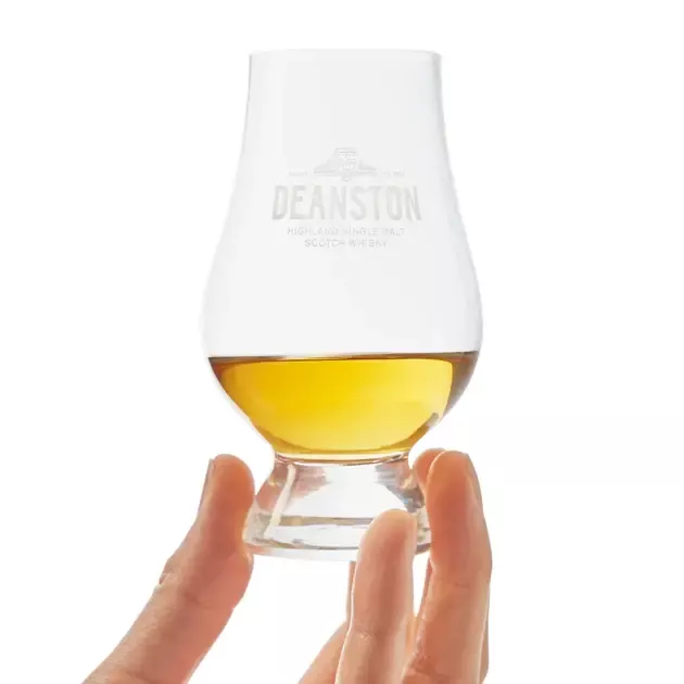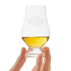 Pohár má ikonický tvar so širokým spodkom a postupne sa zužujúcim hrdlom, ktorý pomáha sústrediť arómu. Vďaka tomu sa otvárajú všetky vrstvy vôní – od jemných ovocných tónov až po medovo-sladké akcenty typické pre Deanston. Masívnejšia noha dodáva stabilitu a umožňuje pohodlné držanie bez zbytočného zohrievania obsahu.