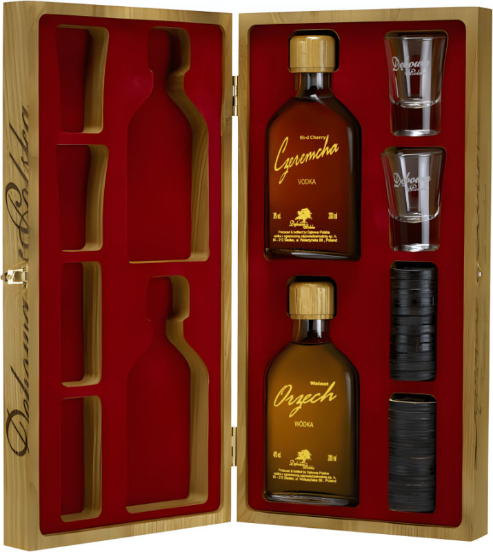 Debowa Polska Vodka ŠACHOVNICA je originálny darčekový set v tvare šachovnice, ktorý poteší každého fanúšika šachu či dámy. V darčekovom obale z masívneho dreva v podobe šachovnice nájdete, všetko, čo potrebujete pre rozohratie dobrej partie s rovnocenným súperom: