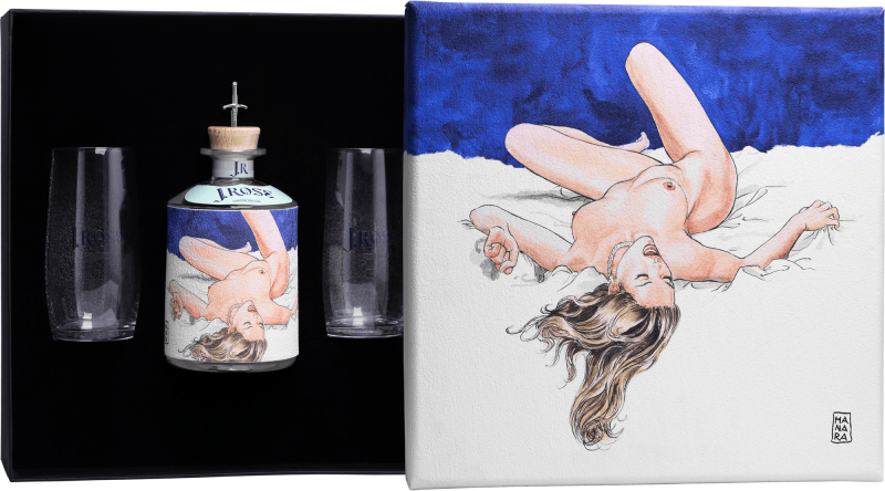 Etiketu je možné z fľaše odlepiť a použiť ako nálepku kdekoľvek si želáte. Dýka z nehrdzavejúcej ocele vsadená do uzáveru je určená na opakované použitie ako prívesok, náušnica alebo piercing. O vzrušujúcejší zážitok sa postará aj darčekový box: elegantná škatuľa, v ktorej sa nachádza J.Rose a dva poháre. Vrchnák boxu sa stáva autentickou maľbou/obrazom od Mila Manara.