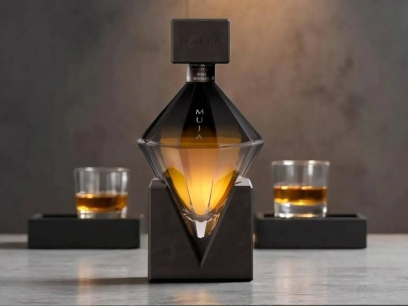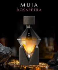 Whiskey Muja Rosapetra nie je len nápoj, ale aj vizuálny zážitok. Fľaša má odvážny geometrický tvar brúseného diamantu, ktorý symbolizuje precíznosť a výnimočnosť. Je vyrobená z hrubého číreho skla s dymovým efektom, ktoré zvýrazňuje jantárovú farbu whiskey. Uzáver z čierneho kovu s vygravírovaným logom MUJA dopĺňa elegantný betónový podstavec, ktorý slúži ako stabilný stojan aj estetický prvok.