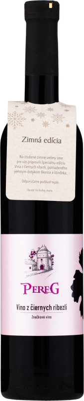 Pereg z čiernych ríbezlí Zimná edícia 11% 0,75l - víno z čiernych ríbezlí je vyrobené výlučne z kultivarov tohto čierneho bobuľového ovocia. Ihneď osloví svojou intenzívnou ríbezľovou arómou a sýtou rubínovou farbou. Príjemné kyselinky dovážané zbytkovým cukrom vytvárajú plné harmonické víno jedinečnej chuti, vhodné na všedné aj nevšedné chvíle.