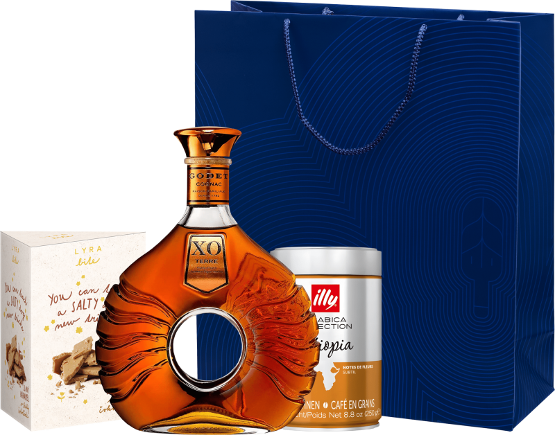 Prémiový darčekový set Godet XO Terre (set 1 x 0.7 l) - luxusný darčekový set pre skutočných znalcov, ktorý spája výnimočný francúzsky koňak Godet XO Terre, výberovú talianskú kávu Illy Etiopia 250 g a prémiovú slovenskú čokoládu Lyra BITE Slaný karamel. Všetko je zabalené v elegantnej darčekovej taške, vďaka čomu je tento set ideálnou voľbou ako luxusný darček na Vianoce, narodeniny, jubileá či firemné príležitosti. Doprajte obdarovanému spojenie francúzskeho luxusu, aromatickej kávy a dokonalej čokolády v jednom exkluzívnom balení.
