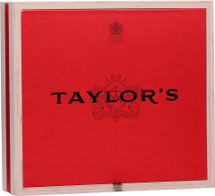 Špeciálne darčekové balenie vín Taylor's Exclusive Set Old Tawny Port v objeme 4x0,375 l. Darčeková krabička je prepracovaná kombinácia červenej farby a prírodného dreva.