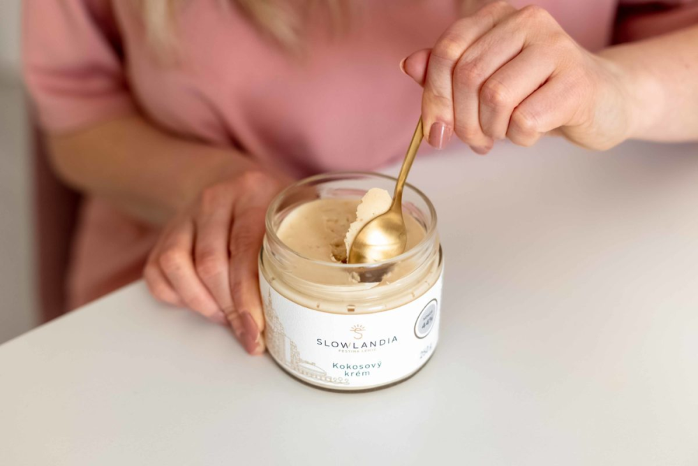 SLOWLANDIA – Kokosový krém 250 g - v spojení sladkých mandlí a kokosu je tu pre Vás lahodný kokosový krém s kúskami praženého kokosu, mandlí a lahodnej bielej čokolády pre ešte lepší gurmánsky zážitok. Je vyrábaný z kvalitných surovín, bez konzervačných látok a palmového oleja.