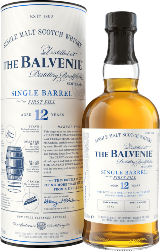 The Balvenie 12-ročná Single Barrel (First Fill) je škótska single malt whisky zrela, ktorá v prvýkrát opätovne naplnených sudoch po bourbone. Úlohou sladového majstra bolo nájsť medzi sudmi whisky len tie, ktoré vystihuje sladkosť a jemný vanilkovo-dubový tón typický pre túto výbornú limitovanú sériu škótskej Balvenie Single Barrel First Fill. Každé vydanie sa plní len z jedného jediného suda do najviac 300 fliaš a nesie jeho číselné označenie.